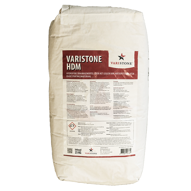 Varistone HDM is een (minerale) waterdoorlatende legmortel op basis van cement, geschikt voor het leggen van allerlei soorten bestrating waar een vaste opbouw gewenst is. De Varistone HDM is optimaal waterdoorlatend waardoor regenwater niet direct onder het straatwerk blijft staan en het straat- en voegwerk minder snel schade oploopt in vorstperiodes.